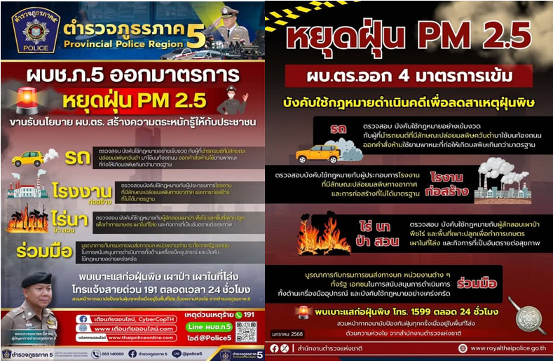 พล.ต.อ.กิตติ์รัฐ พันธุ์เพ็ชร์ ผบ.ตร. สั่งการตำรวจทุกหน่วยเพิ่มมาตรการเข้ม ตรวจสอบ และ บังคับใช้กฎหมายเพื่อลดสาเหตุการก่อฝุ่นละลองขนาดเล็ก PM 2.5 ซึ่งเป็นอันตรายต่อสุขภาพประชาชน